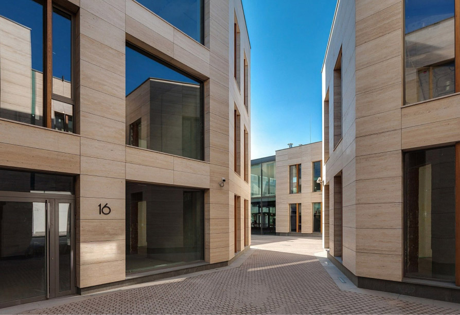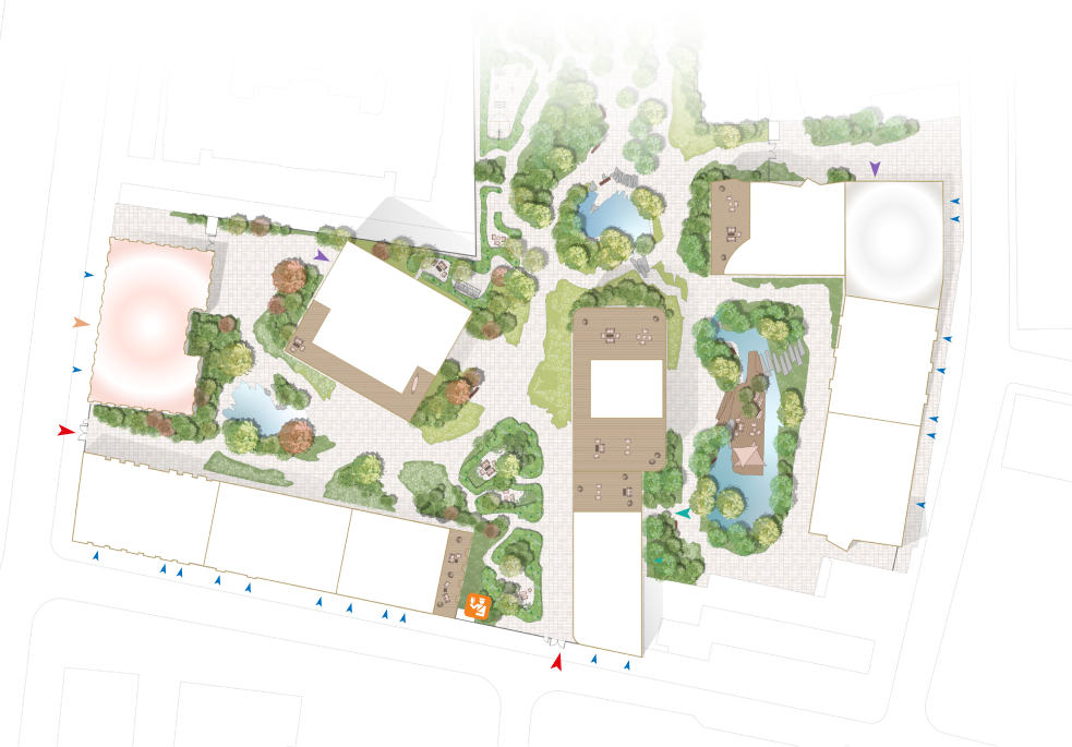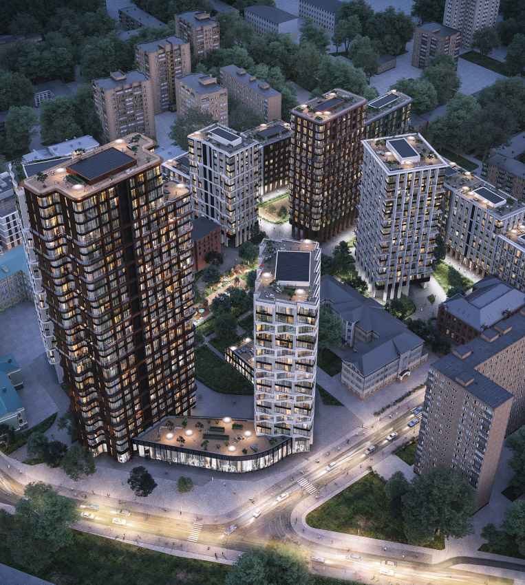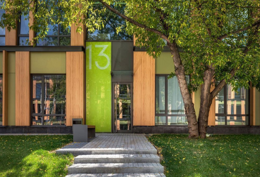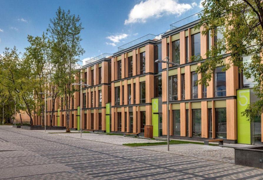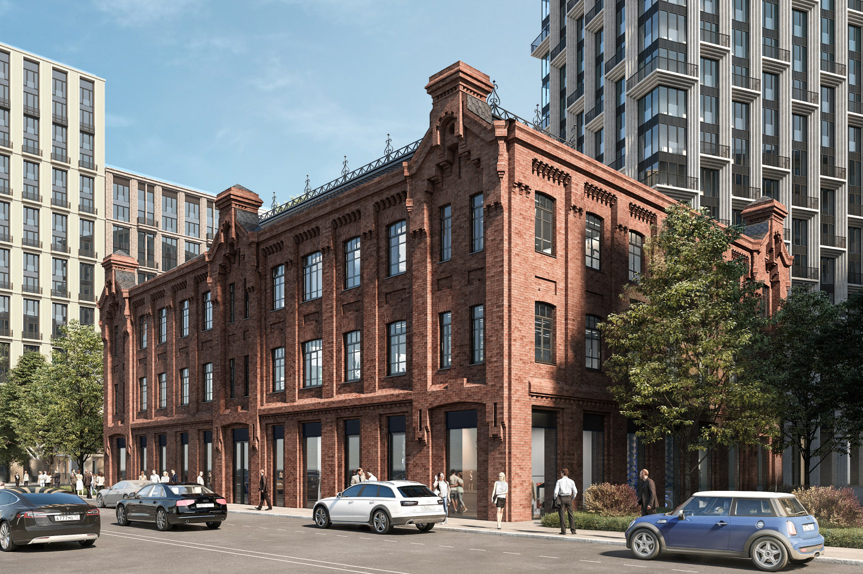 - офисы в трех разных форматах зданий — особняк, офисы с приватными террасами, офисы с общественной террасой на стилобате;